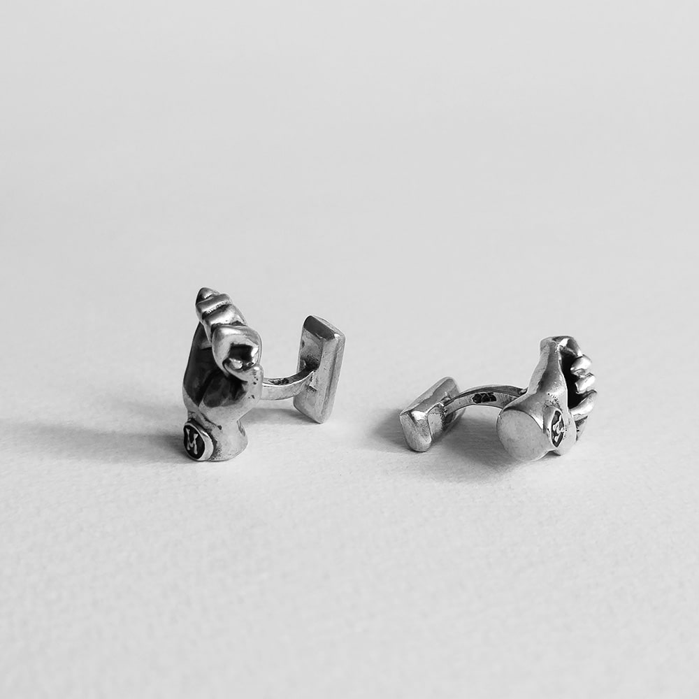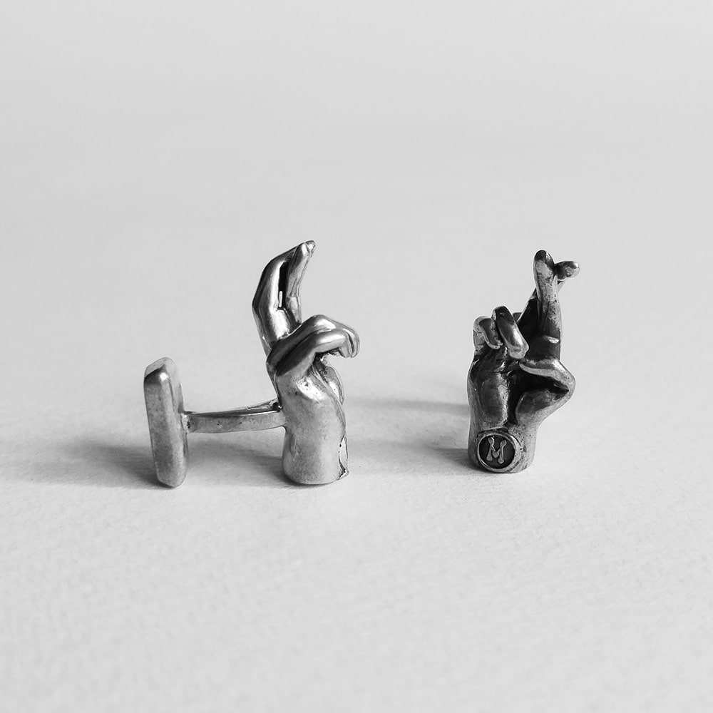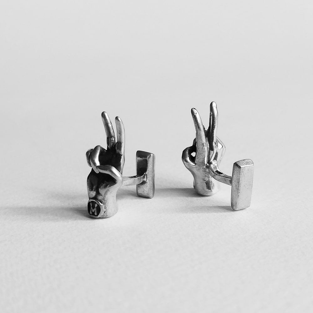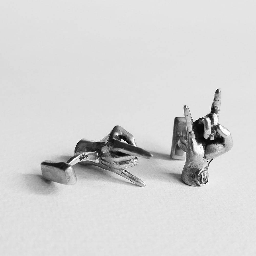 Mancuernillas con diseño de manos con diferentes señales.