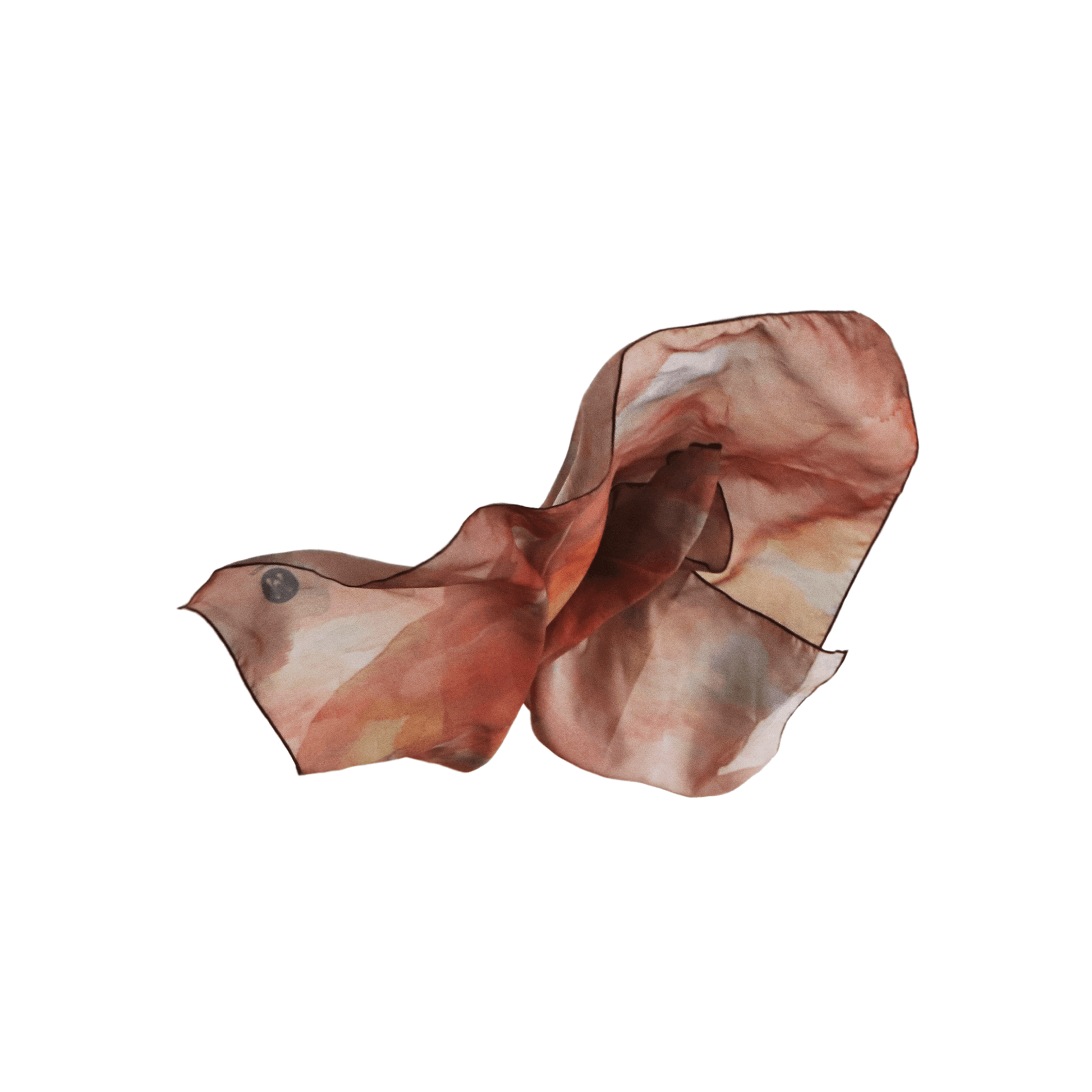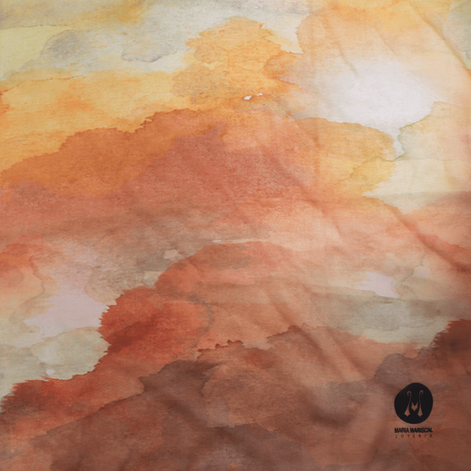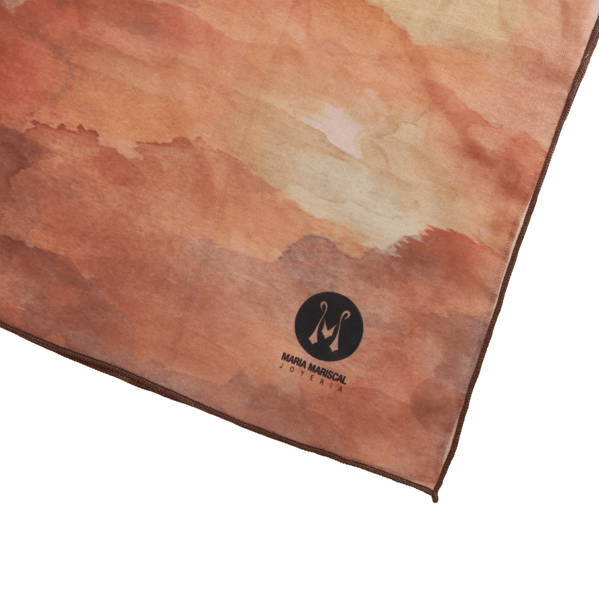 La pañoleta esta diseñada por Valeria Villanueva, el textil está inspirado en los colores del atardecer, momento en que los gemelos bajaron al Xibalbá, y el punto en el que el sol se esconde y la luna sale.
