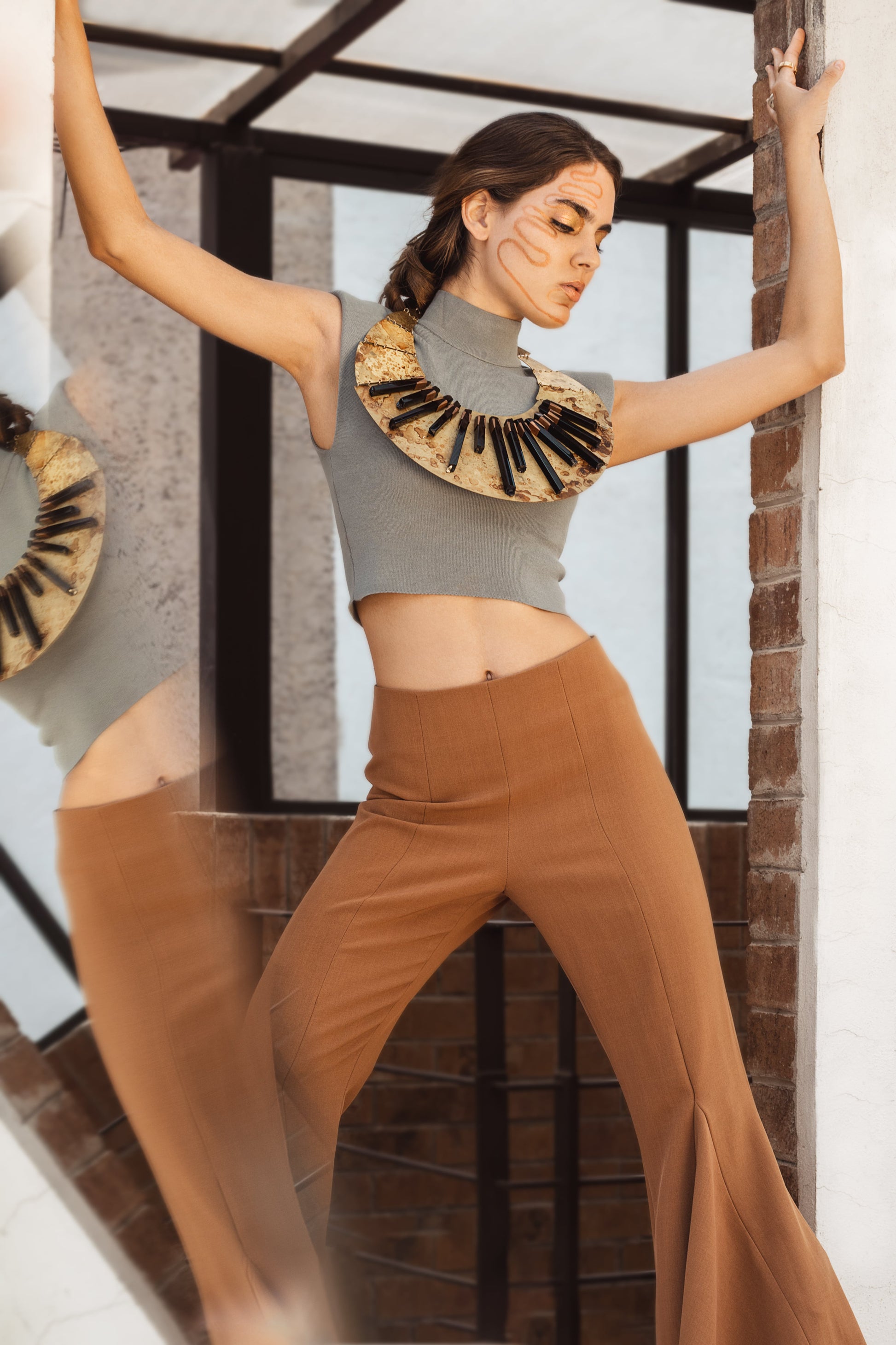 Pechera hecha de lamina de latón con engarces de cobre y prismas de obsidiana negra con remates lascados.