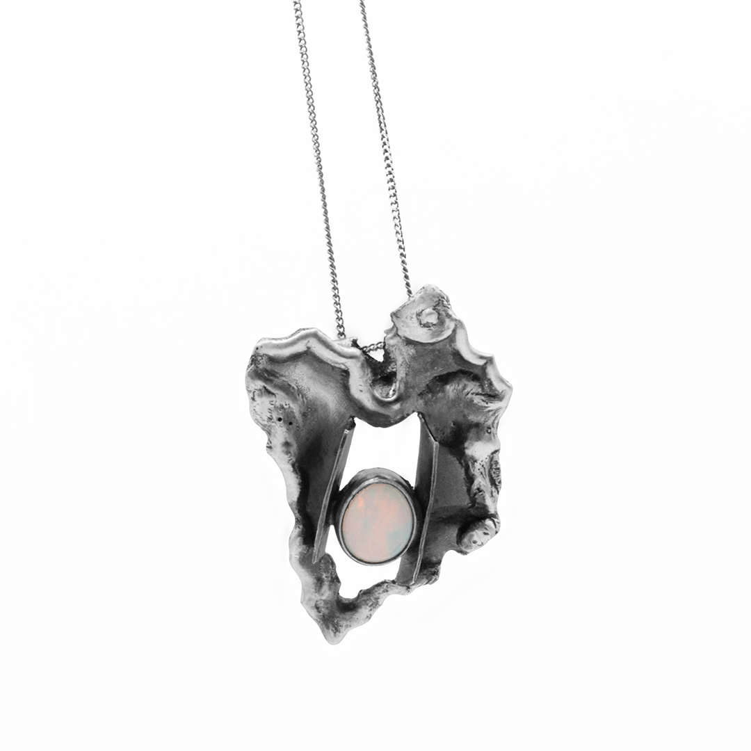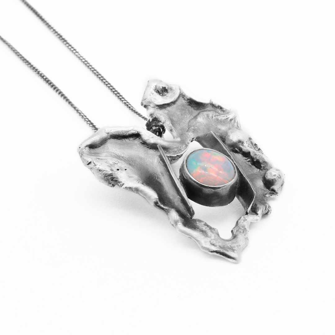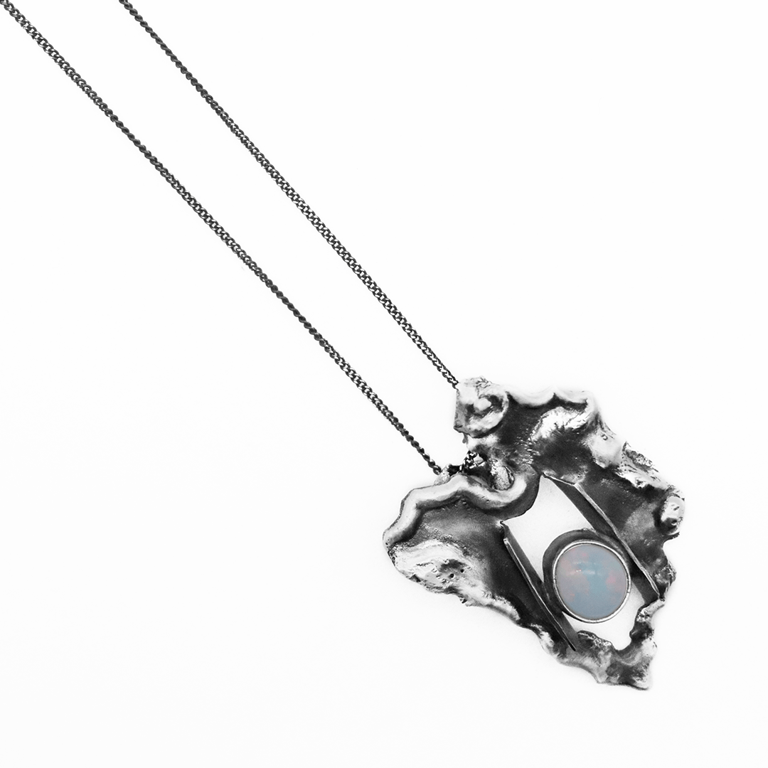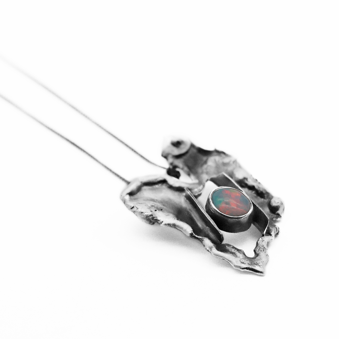 Pendiente pieza unica en plata reticulada con opalo engastado sobre un bisel de plata 999. incluye cadena de plata de 60 cm.