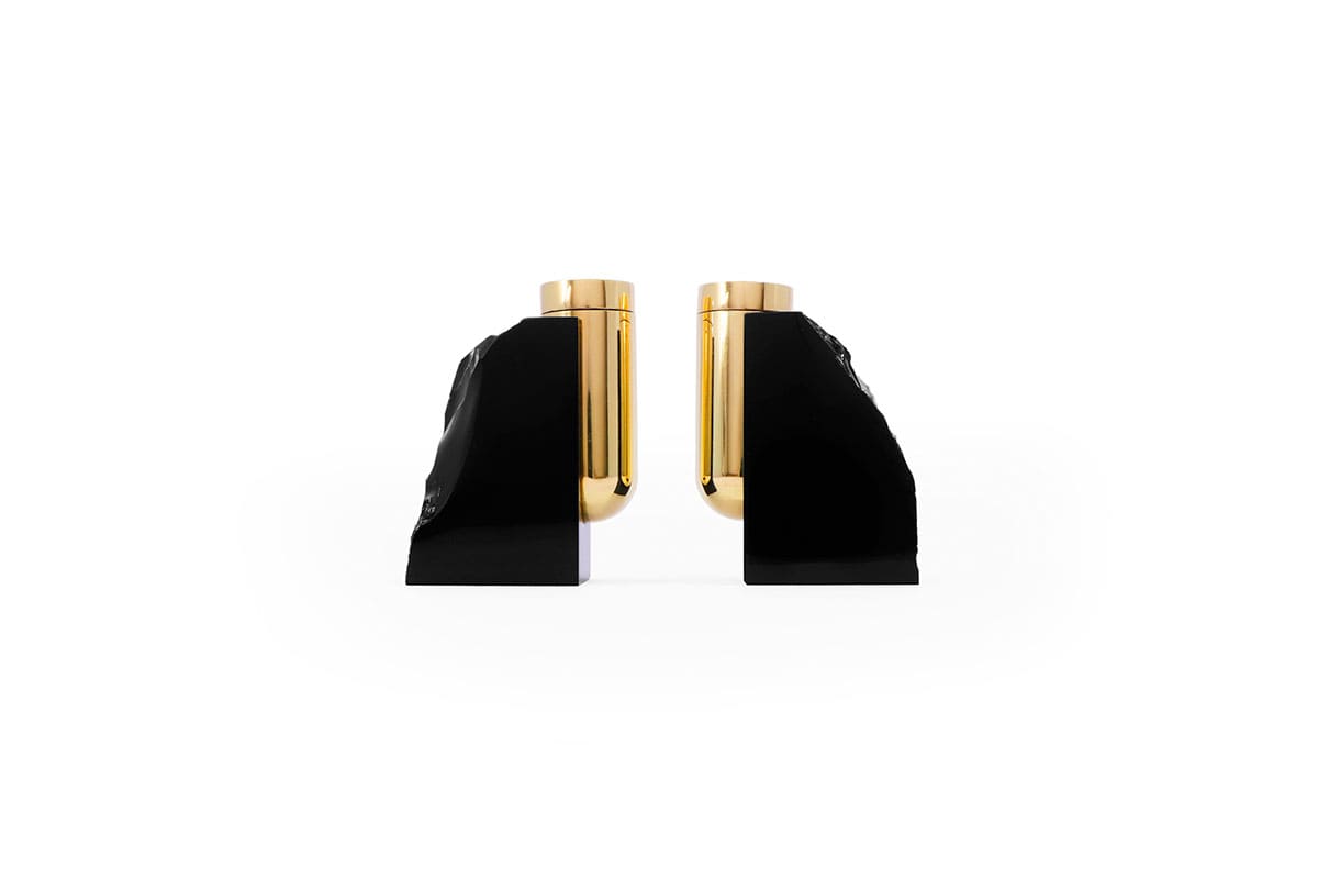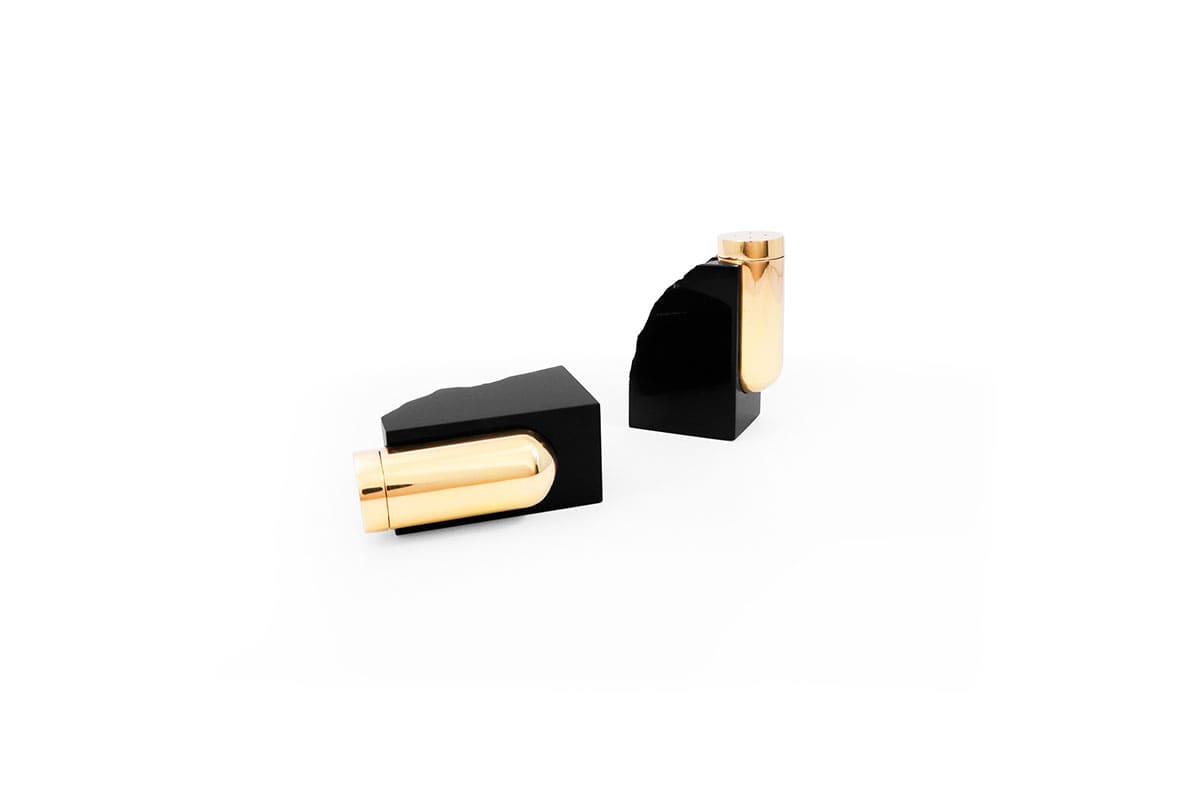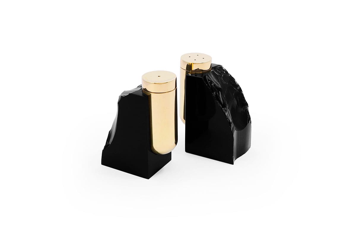 Salero y Pimentero en Laton Natural Pulido con agarradera de Obsidiana, medidas n x n x n.